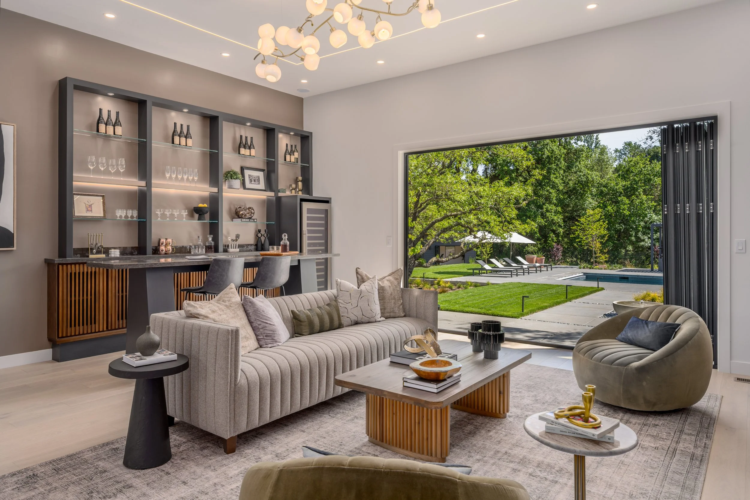 New 8x12 bi-fold door opening to steps leading to the outdoor fountain, walkway and pool