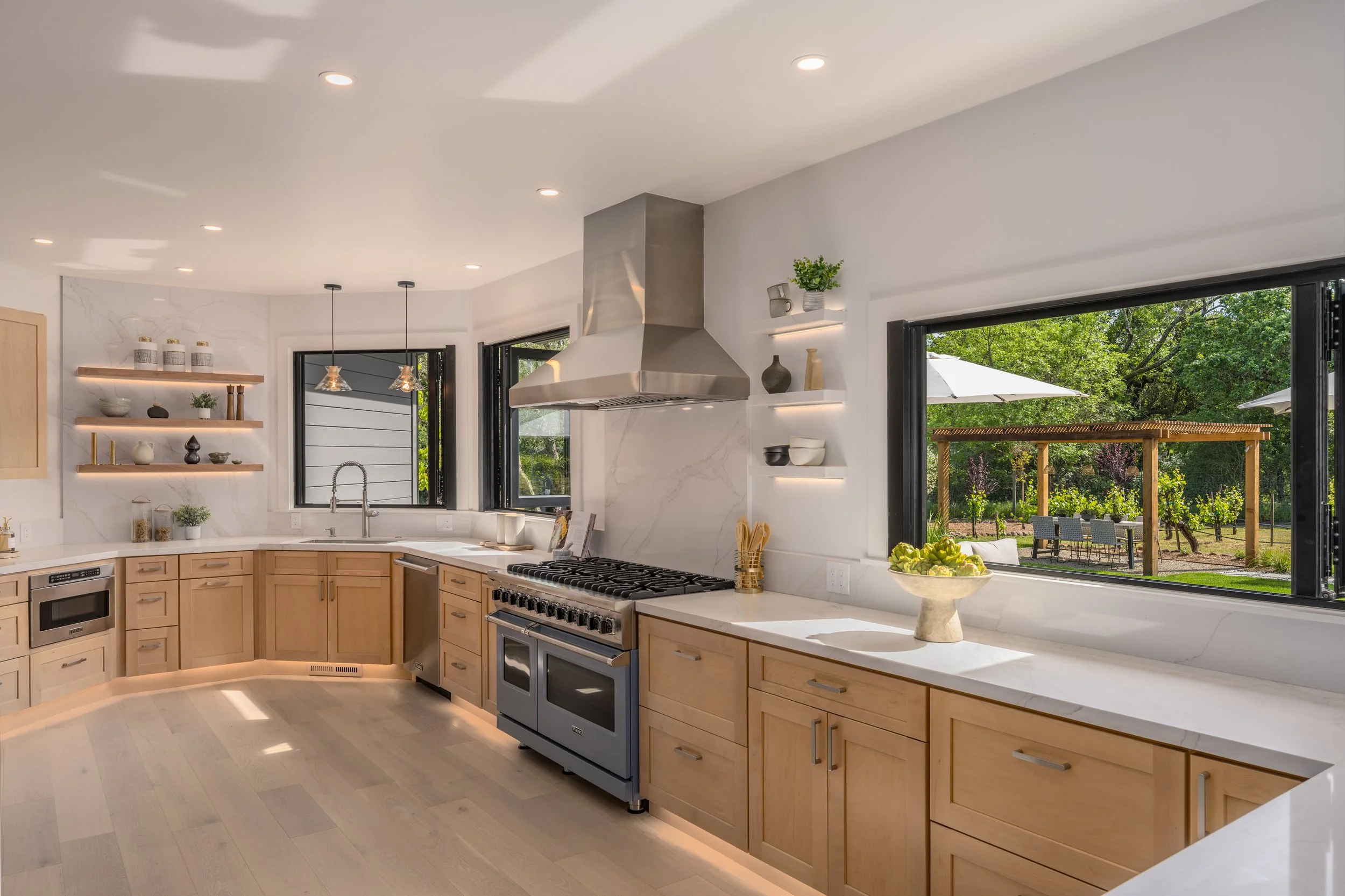 Fully landscaped exterior with lush softscape & hardscape |Batu (mahogany) wood decks + over a dozen added olive trees + crape myrtles + redbud trees + ornamental plum trees + extensive grasses + flowering plants + large terracotta & decorative pots throughout